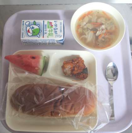 7月7日(火)給食の献立は、かぼちゃのミ−トグラタン、スープ、すいか、パン、牛乳でした。