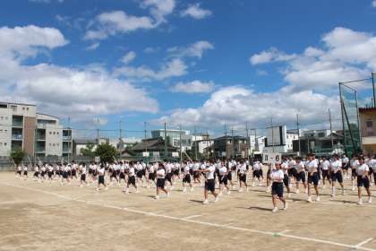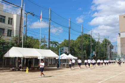 昨日と比べて少し雲が出て日差しを遮り、風もある中、入場行進の練習を行いました。学級旗をたなびかせながらの行進が楽しみになってきました!