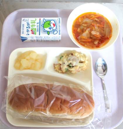 9月3日(木)給食の献立は、豆乳マカロニグラタン、トマトスープ、洋なし(カット缶)、パン、牛乳でした。
