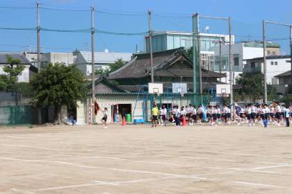 体育大会のプログラムに沿って、入場行進、校旗掲揚、選手宣誓、競技上注意等の開会式練習及びラジオ体操の練習を行いました。