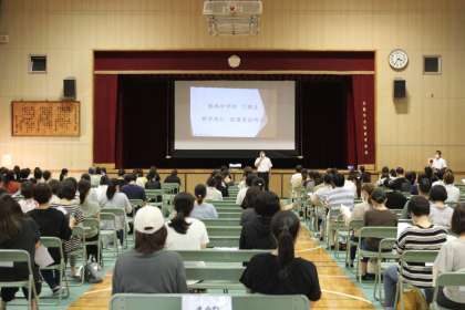 まず、高島校長先生からあいさつがありました。上尾先生から行程・持ち物・服装等の説明があり、続いて島原学年主任から感染症予防対策、発熱等による体調不良者の対応の説明、及び修学旅行実施に向けたご協力をお願いしました。