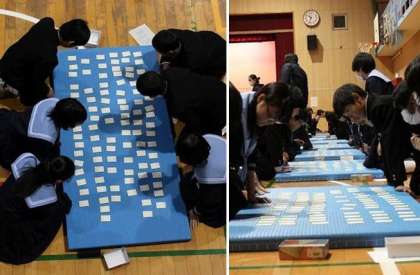 2年生は一度経験しており、昨年より数段レベルアップしたように思います。太鼓の音で静まり、読み手の先生が上の句を詠みあげると、すぐさま「ハイ」と下の句の札を取る声が聞こえました。そのあと喜ぶ生徒や悔しがる生徒の歓声があがり、大いに盛り上がった大会となりました。