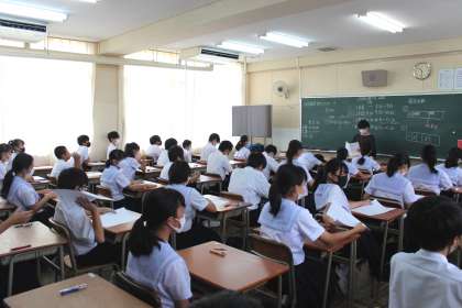 2年生の教室では、英語のテスト問題、解答用紙がが配布され、チャイムが鳴ると、勢いよく用紙がひっくり返され、問題に取り組んでいました。