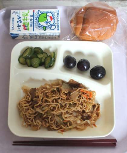 9月30日(水)給食の献立は、焼きそば、きゅうりのしょうがづけ、ぶどう(巨峰)、パン、牛乳でした。