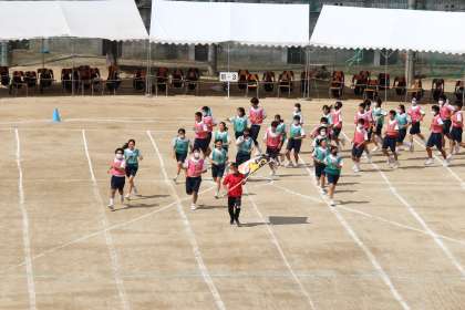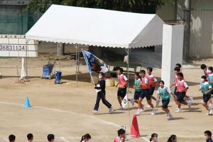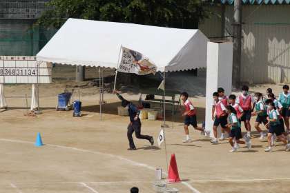 学年種目(全員リレー)が始まります。学級旗を先頭に各クラスが入場します。