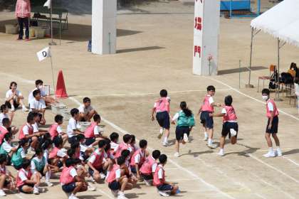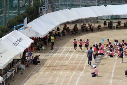 学年種目(全員リレー)は、生徒の安全を考慮して、全7クラスを2つに分けてタイムレースとしています。最後の最後まで結果がわからないレースです。
