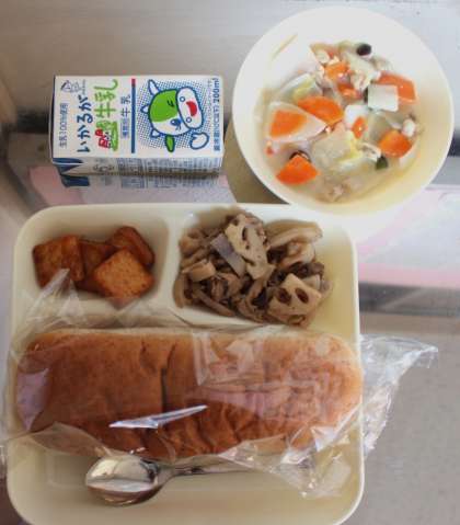 10月5日(月)給食の献立は、はくさいのクリーム煮、あつあげのピリ辛じょうゆかけ、豚肉とれんこんのオイスターソースいため、パン、牛乳でした。