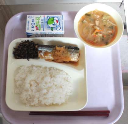 10月6日(火)給食の献立は、さんまのみぞれかけ、みそ汁、牛ひじきそぼろ、米飯、牛乳でした。