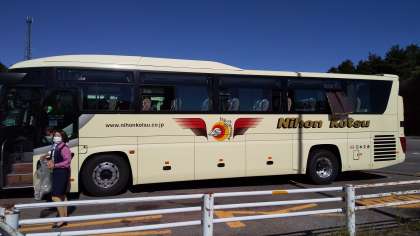 バスは、SAの駐車場では、窓を全開にして換気しています。