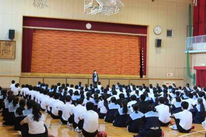 集会では、阿部先生から…今日6限に生徒会立会演説会が開催されます。阪南中学校を「いい学校」にしようと、多くの人が立候補してくれています。今回の選挙では、定数を超える立候補があり落選する人もでます。立候補者の演説を真剣に聞いて、投票してください。みなさんも阪南中学校を「いい学校」にするために、協力してあげてくださいと、お話がありました。