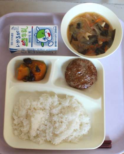 10月20日(火)給食の献立は、和風ハンバーグ、みそ汁、かぼちゃのいとこ煮、米飯、牛乳でした。