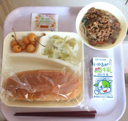給食の献立は、タンタンめん、キャベツの甘酢づけ、さくらんぼ(缶)、パン、アプリコットジャム、牛乳でした。