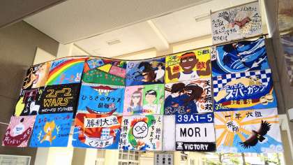 体育大会の入場行進で各クラスの先頭を飾った学級旗を玄関入口に掲示しました。各学年の良い旗のクラスを1つずつ選出し、後日最優秀と優秀クラスを表彰します。