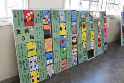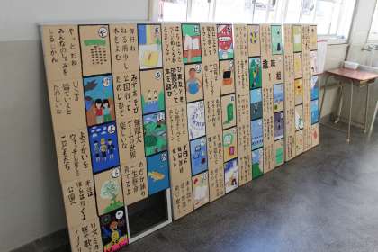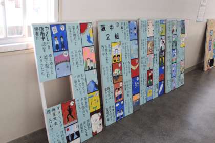 1組「趣味」、2組「阪中」、3組「友情」をテーマに絵札と読み札を描きました。夏休みから取り組み、絵やレタリングを丁寧に仕上げました。
