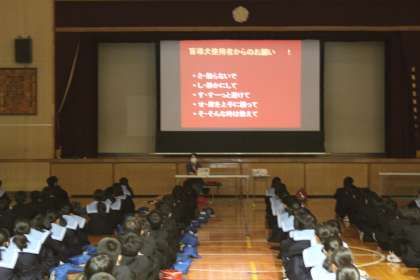 11月5日(木)6限 1年は体育館で「福祉体験学習」として、阿倍野区社会福祉協議会のご協力のもと、視覚に障がいのある方を講師にお招きし、視覚障がいのこと、盲導犬との関係などについて話をしていただきました。