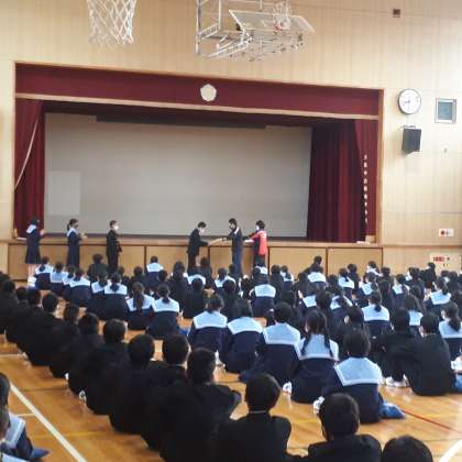 集会では、校外学習におけるオリエンテーションで優秀な成績をおさめた班が、表彰され、京都鉄道博物館オリジナルクリファイルが贈られました。