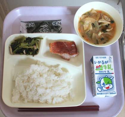 11月16日(月)給食の献立は、あかうおのしょうゆだれかけ、みそ汁、こまつなのいためもの、焼きのり、米飯、牛乳でした。