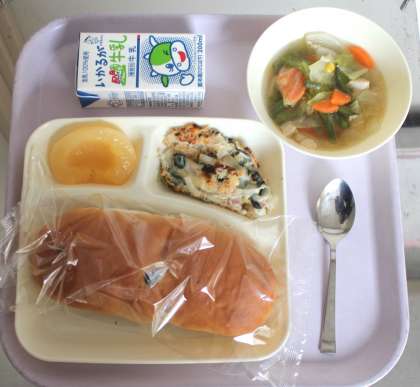 給食の献立は、スープ煮、ほうれんそうのグラタン、白桃(缶)、レーズンパン、牛乳でした。
