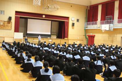 11月26日(木)6限 1年生は体育館で「福祉学習」として、阿倍野区社会福祉協議会のご協力のもと、視覚に障がいのある谷口真大さんを講師にお招きし、ご講演いただきました。