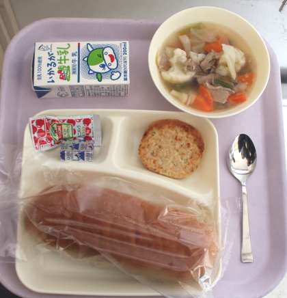 給食の献立は、とうふハンバーグ(ケチャップ付)、カリフラワーのスープ煮、固形チーズ、パン、牛乳でした。