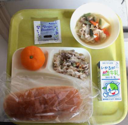 給食の献立は、豚肉とじゃがいものスープ煮、きのこのドリア、みかん、パン、ブルーベリージャム、牛乳でした。