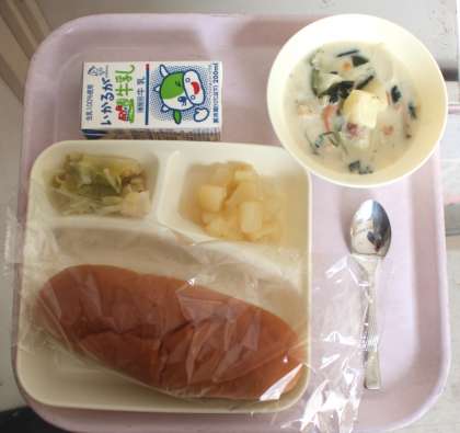 給食の献立は、ほうれんそうのクリームシチュー、キャベツのサラダ、洋なし(カット缶)、黒糖パン、牛乳でした。