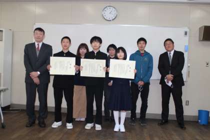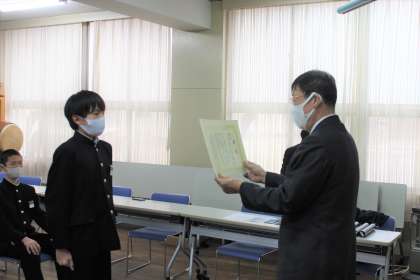 3月2日(火)昼食後、副読本「快適な住まい」読後鑑賞文コンクールにおける入賞した3名(銀賞 Hくん、銅賞 Hさん、佳作 Iくん)が、(株)全教図 大阪なか支店 支店長 大岡様より表彰状が授与され、記念品が贈呈されました。おめでとうございます!