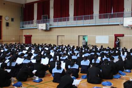 3月4日(木)6限に、明日開催予定の1、2年生マラソン大会について、競技上の諸注意を行いました。