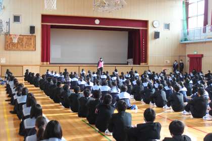 マラソン大会が中止となり、苦しい中で走り続けることがなくなりました。何事にも一生懸命がんばることが大切です。気持ちを切り替えて、今を一生懸命に生きてくださいと、お話がありました。