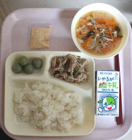 給食の献立は、豚肉と野菜のいためもの、すまし汁、きな粉よもぎだんご、米飯、牛乳でした。