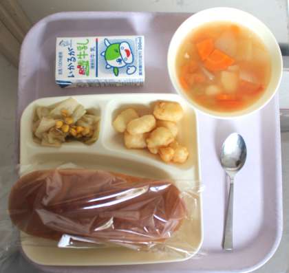給食の献立は、いかてんぷら、フレッシュトマトのスープ煮、サワーソテー、黒糖パン、牛乳でした。