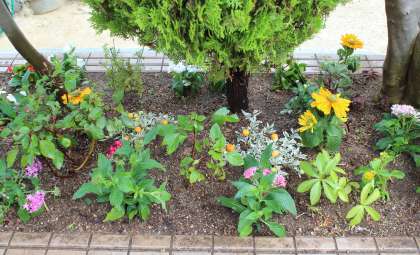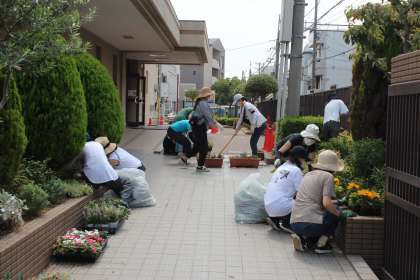 7月13日(火)午前、夏空が広かる晴天の下、PTA施設・保健委員会のみなさんがグラウンド入り口にある花壇、プランターの花を植え替えてくださいました。