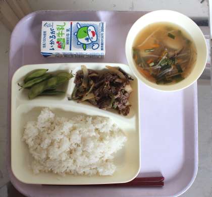 給食の献立は、プルコギ、トック、えだまめ、米飯、牛乳でした。