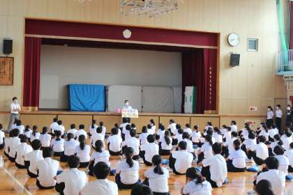 集会では、渡邊先生から…皆さんご存知の「ドラえもん」は、昔からテレビで放送されているのですが、私が小さい頃に見た話の中で、未来の子どもたちがオンライン授業を受けているシーンがありました。それから何十年も経って、ほんとうにオンライン授業が行われるようになって、作者の藤子・F・不二雄の想像力に驚かされました。