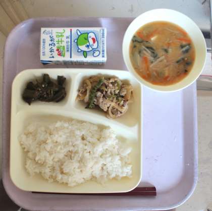 給食の献立は、豚肉の甘辛焼き、みそ汁、オクラのおかかいため、米飯、牛乳でした。