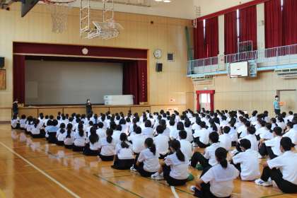 集会では、宮畑先生から…来週には体育大会が開催されます。1週間後には中間テストが実施され、合唱コンクール、文化発表会と続きます。各行事に一生懸命取り組むことで、みなさんは大きく成長していきます。勝敗が結果としてありますが、みんなで協力して一生懸命に取り組むことが大切ですと、お話がありました。
