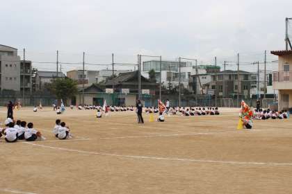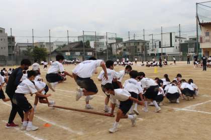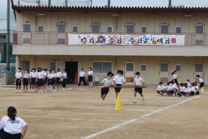 5限目に1年学年種目「台風の目」の練習を行いました。3名一組のチームワークでリレーを行い、アンカーがゴールすれば学級旗を中央に掲げます!