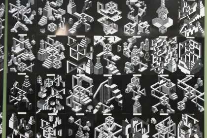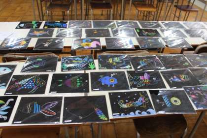 3年生のスクラッチボードは、図法を使って不思議な世界を表現しています。