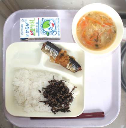 給食の献立は、さんまのみぞれかけ、みそ汁、牛ひじきそぼろ、米飯、牛乳でした。