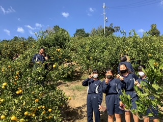 趣のある「上の太子みかん狩り」の看板を撮影、山の斜面にみかんがたわわに実っています!