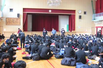 3、4限目に体育館で、前日指導を行い、持ち物の最終確認や現地での行動確認を行いました。