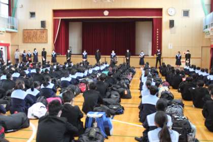 早朝6時30分に体育館に集合し、修学旅行出発式を行いました。