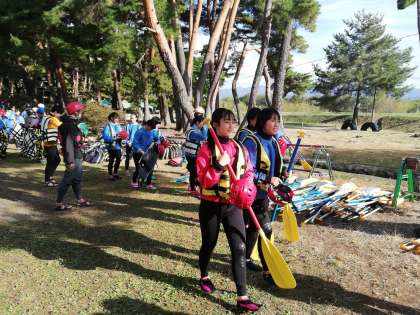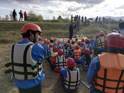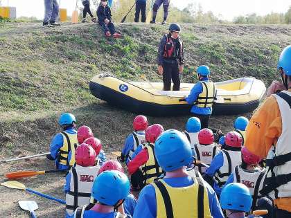 ラフティングについて、説明を受けています。パドルの使い方などを教えてもらっています。