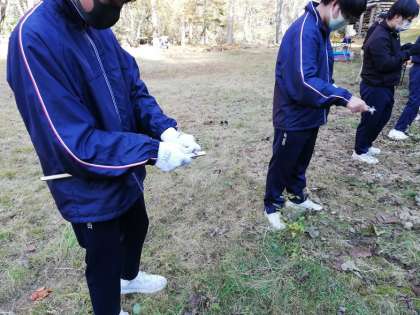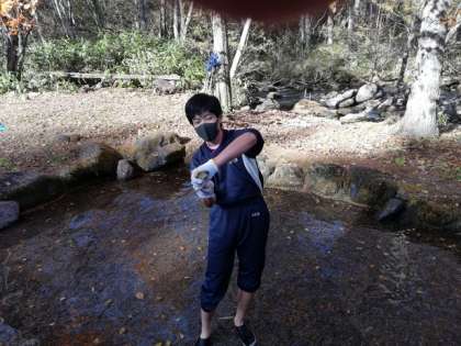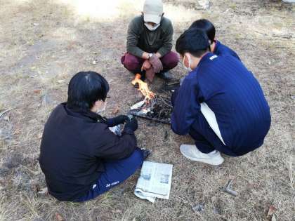午後の魚つかみです。火起こしから始まり、串つくり、魚つかみ、さばき、串さし、焼きへと進みます。