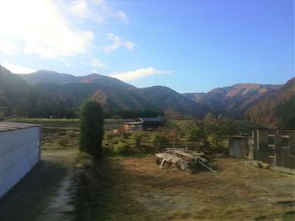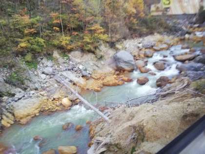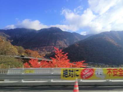 紅葉満喫ドライブを楽しみながら、バスは高山へ山を下っています!