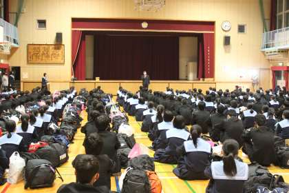 解散式では、高島校長先生から、宿舎の方や体験活動のスタッフさんから阪南中学校の生徒のみなさんにお褒めの言葉をたくさんいただきました。修学旅行ではみんなよくがんばっていたと思います。しかし、気のゆるみが生まれ反省すべきところもありました。みなさんへの期待が大きい分、残念な気持ちもあります。一人一人、気のゆるみそうなときは、踏み止まって行動してほしいと思いますと、お話がありました。