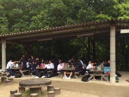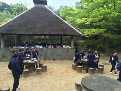 11:30、激しい雨が降ったり止んだりしています。子どもたちは自分で作ったカレーを食べて満足気です。
