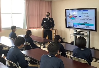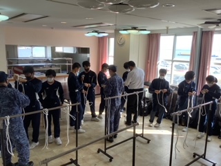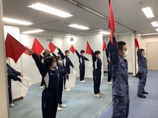 海上自衛隊阪神基地隊でお世話になりました。あいにくの雨のため、屋内での活動が主になりましたが、操舵シミュレーション、手旗実習、ロープ実習など内容盛りだくさんで、皆さん自衛官の方々の説明をよく聞いて、しっかりと活動しました。