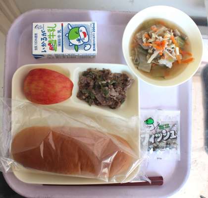 給食の献立は、牛肉のオイスター焼き、中華スープ、りんご、ミニフィッシュ、黒糖パン、牛乳でした。