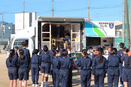 起震車「だいち」で、震度7までの揺れを体験しました。